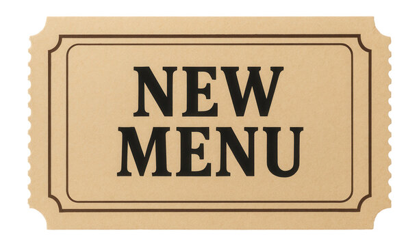 Tan tag sticker with NEW MENU announcement in bold text, inviting retail promo offer on transparent background.