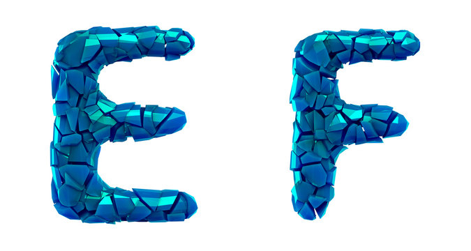 Letter set E, F made of 3d render plastic shards blue color.