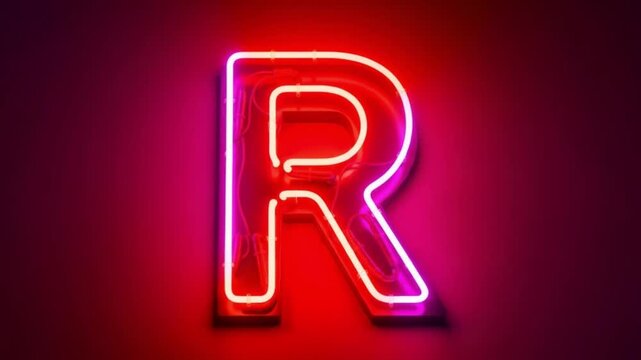 Glowing neon letter R sign vibrant pink and red illumination against a dark red gradient background creating a retro vintage aesthetic perfect  4K Ai HD video.