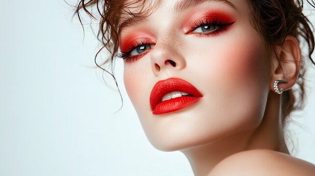 A fashion portrait of a model with bold makeup, white background, high-end look
