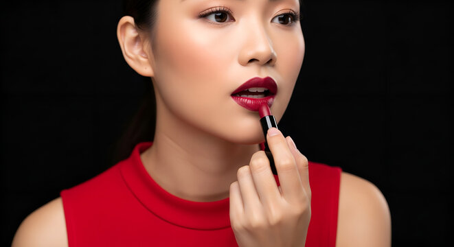 The striking contrast of dark matte lipstick on full lips creates a bold statement, highlighting their natural shape and allure against a soft, muted background