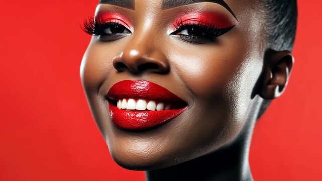 Vibrant Red Elegance: A radiant beauty with a captivating smile, showcasing striking red lipstick and bold eye makeup against a monochromatic red backdrop, embodying glamour and confidence.