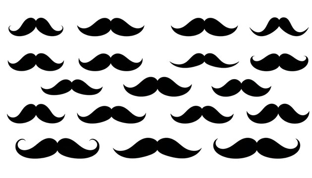 Flat vector sheet close-up of assorted black mustache silhouettes and lined vintage handlebar, chevron and bushy styles centered bold arranged in three columns barber logo set