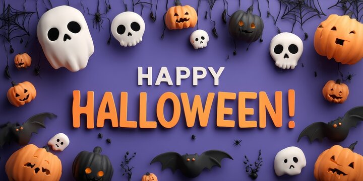A festive purple banner with bold orange text that reads 'Happy Halloween'. The background is decorated with spooky elements, perfect for Halloween wallpapers in high definition.