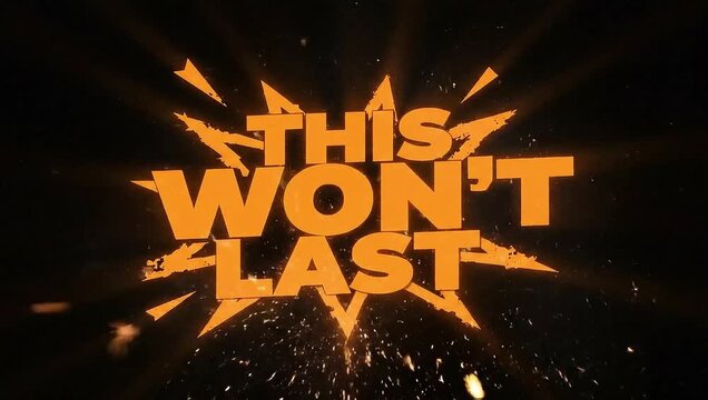 A video with a bold message saying This Wont Last in bright orange letters surrounded by sparks on a dark background