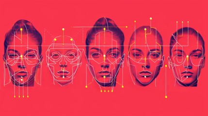 A visually striking digital artwork featuring AI-driven facial recognition with geometric mapping on human faces, set against a bold red background. AI generated.
