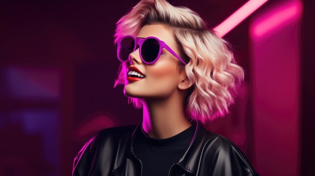 80s Chic, woman in a red leather jacket and sunglasses channels the bold spirit of the 1980s with timeless style