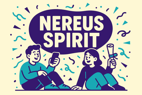 Nereus Spirit Banner. Nereus Spirit banner, flat vector illustration, bold oversized text inside rounded blob, cartoon characters sitting and chatting, holding
