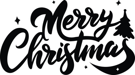Merry Christmas Brush Typography Black Silhouette on White, Black Silhouette of Merry Christmas Brush Lettering Vector Design