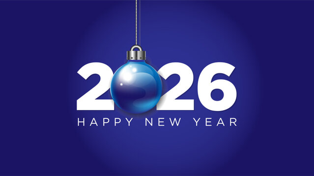 Elegant Happy New Year 2026 design featuring bold white numbers with a hanging blue ornament on dark background