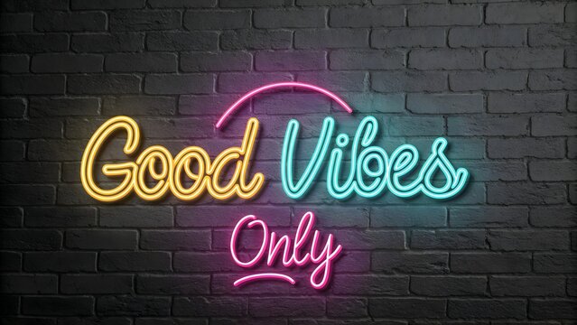 Good Vibes Banner. Good vibes only banner, flat vector illustration, bold oversized text inside rectangular frame, cartoon characters jumping and waving around