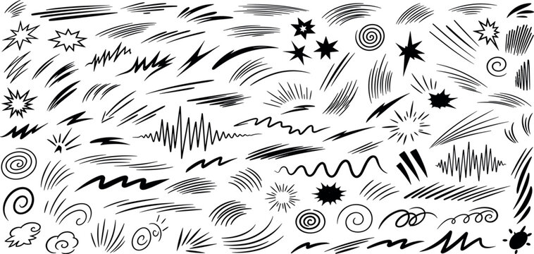 Hand-drawn doodle and scribble set. A large collection of abstract black lines, comic effects, swooshes, and emphasis marks for design.