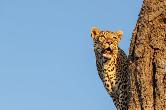 Leopard, Panthera pardus, standing in a tree.