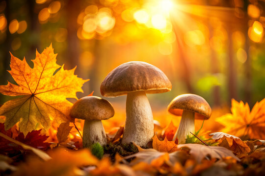 Three mushrooms are on a pile of leaves in the autumn. The mushrooms are brown and are surrounded by orange leaves. The scene has a peaceful and serene mood