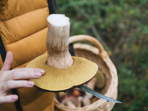 Woman touching king bolete mushroom in forest