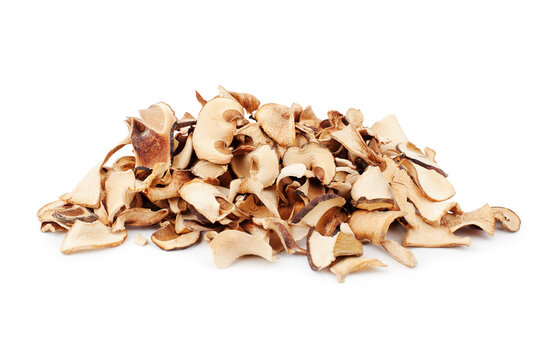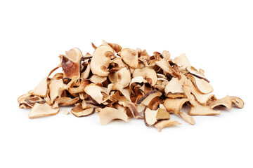 Edible dried mushrooms pile on white background isolated close up, heap of dry boletus edulis, chopped brown cap boletus, sliced penny bun, pieces of cep, porcino or porcini, cutted white fungus