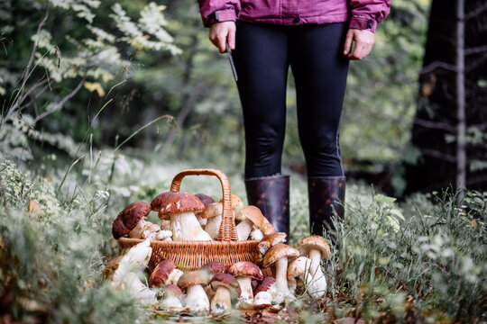 Basket with edible white mushrooms. Boletus edulis. Collect porcini in forest