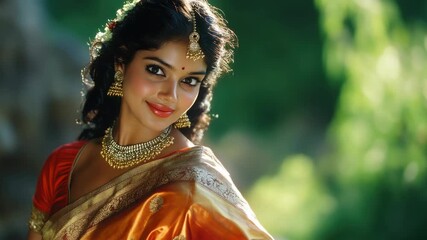 A beautiful Bollywood actress in traditional Indian attire, smiling brightly for a candid portrait. Her vibrant makeup and elegant saree accentuate her glamorous appearance.