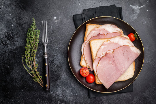 Ham sandwich, toast with sliced Prosciutto Cotto. black background. top view