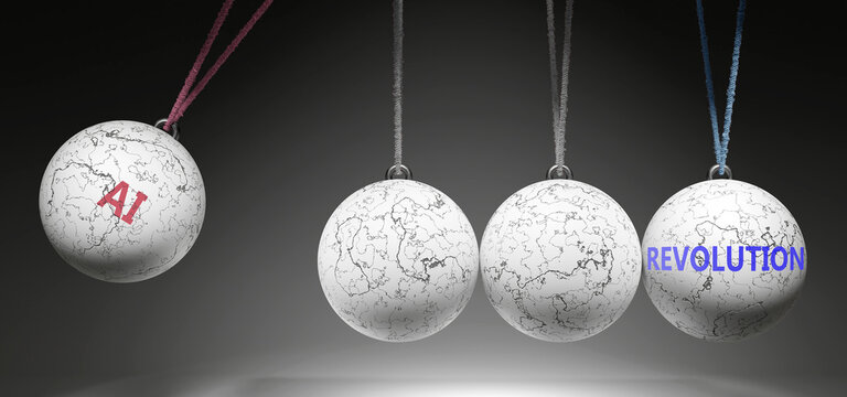 Ai and Revolution - cause and effect relationship. A Newton cradle metaphor showing how ai results in revolution. It initiates revolution. ,3d illustration