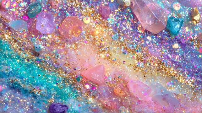 vintage glitter collage, fancy pastel background, chaotic holographic texture, iridescent gold dust, dreamy maximalist aesthetic, sequin sparkle, pastel galaxy, cosmic fantasy, glitter storm