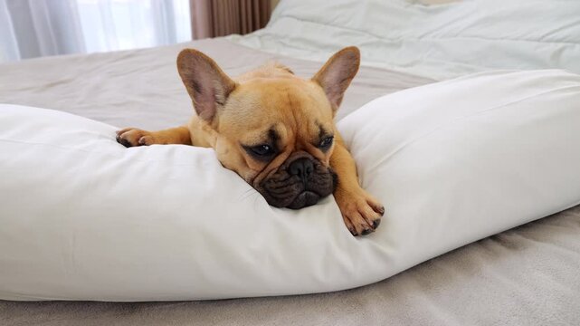 Adorable dog lying comfortably on bed, resting over bolster pillow with slightly grumpy yet irresistibly sweet expression. Her face suggests mild disapproval, as if quietly wishing to be left alone