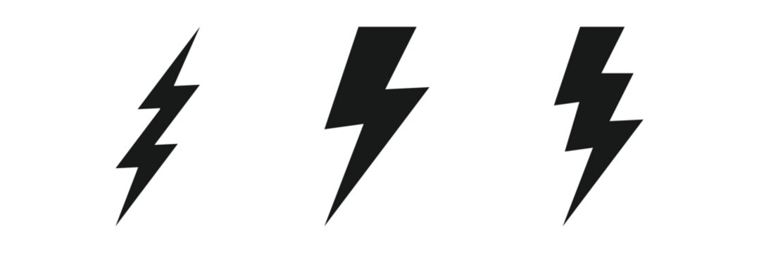 Lightning bolt icon. Flash symbol, thunderbolt, blitz lightnings strike sign. Electric energy black silhouettes, power concept. Vector isolated dynamic sports logo set