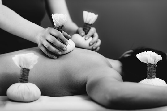 Kizhi massage or herbal bolus bags Ayurveda massage, hands of an Ayurveda Massage therapist pressing herbal bolus bags onto client’s skin