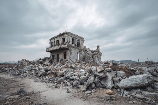 Destroyed building standing in war-torn urban landscape under cloudy sky