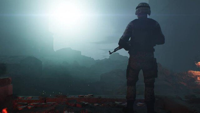 3D render of a soldier in ammunition with a machine, gun standing on the ruins blazing in flames after the bombing of the city at dawn