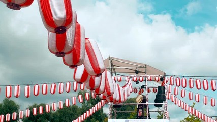The stage of the Yagura with a big japanese taiko drum Odaiko. Many paper red-white lanterns Chochin swinging in the wind on white clouds background. Scenery for the holiday Obon when people dance of