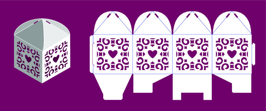 Wedding bonbonniere with hearts. Gift box for valentines day. Laser cutting vector template. Openwork cube gift box. Vector silhouette isolated.