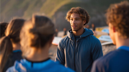 An instructor leading a group through warm-up exercises on the beach before a surf lesson, promoting fitness and teamwork among participants ready to tackle the ocean waves together. cinematic