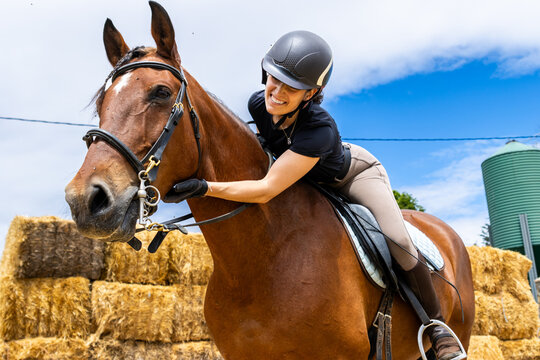 Portrait of a young woman interacting with her horse. Horsemanship concept: Bond between a female equestrian and her brown warmblood horse