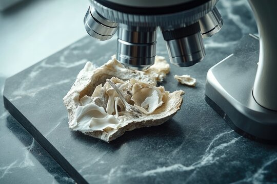 Microscope poised over fragmented bone sample for scientific analysis.