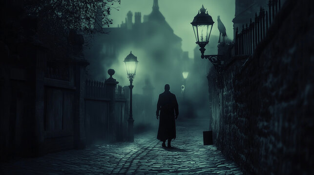 A skeletal figure walking down a cobblestone street, illuminated by old gas lamps, gothic arthouse pictures on the theme of halloween