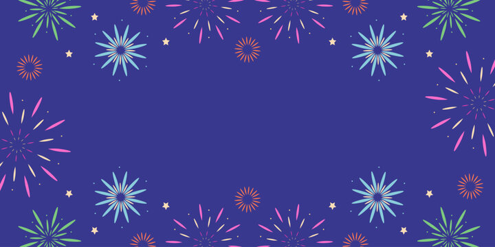 Fireworks background against the night sky with an oval space for text. Vector hand drawn illustration for your projects.