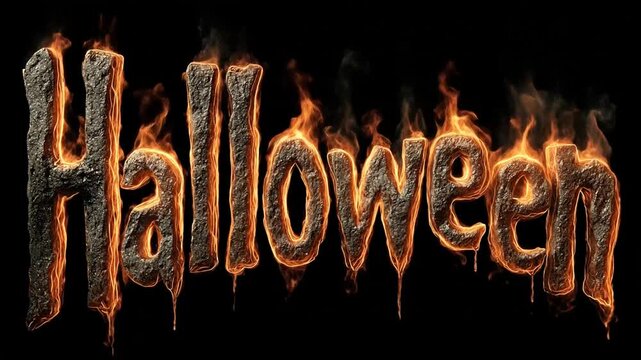 A spooky Halloween text effect. The word, 'Halloween' is crafted in stone & fire on black backdrop