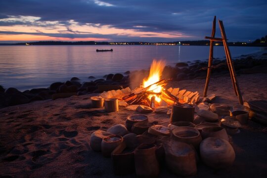 beach bonfire with a clam bake setup nearby, created with generative ai