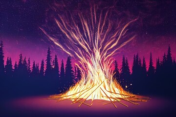 illustration of big bonfire with sparks and particles in front of forest and starry sky