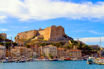 View of Bonifacio town located on high cliff above sea, Corsica island, France