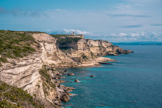 White coastal cliffs and azure waters from scenic Promenade des Falaises viewpoint near Bonifacio