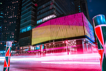 Colorful LED Light Display on Modern Building with Motion Trails at Night In Bonifacio Global City, Taguig City, Metro Manila, Philippines, Circa 2018