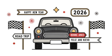Vintage Car with New Year's Greetings and Flags retro car 2026