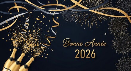 2026 Bonne Annee french text. Happy New Year 2026, luxury fireworks greeting for holiday animated video