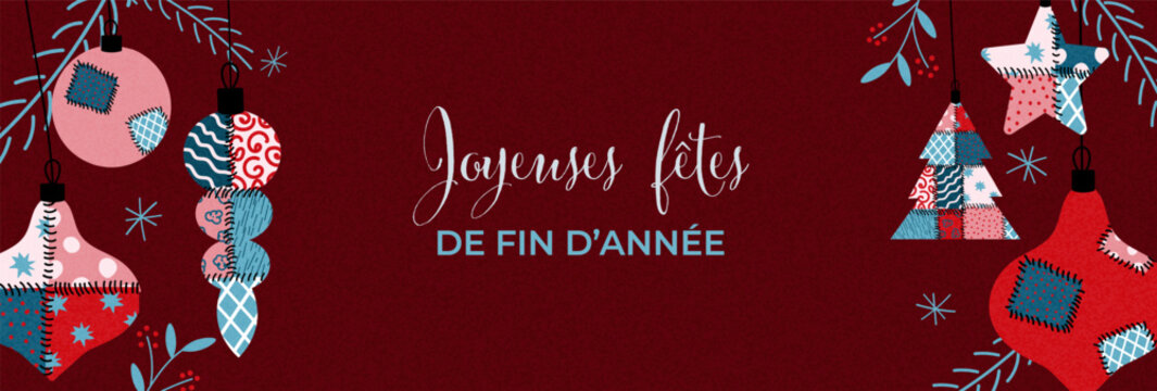 Patchwork Christmas Poster in French. Hand drawn card with stitched patterns on a deep red with branches ornaments, tree, baubles end French text JOYEUSES FETES DE FIN D'ANNEE. Handcrafted style