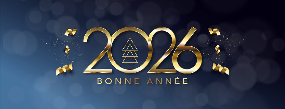 Happy new year background written in French language Bonne Année in yellow gold letters and festive backdrop with snow and bokeh light