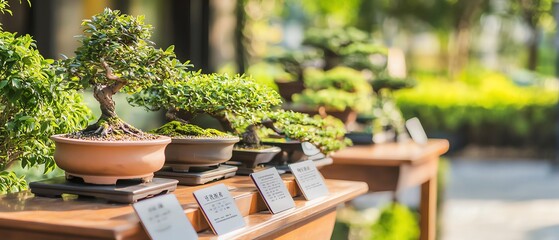 A beautiful display of bonsai trees in various shapes and sizes, showcasing the art of miniature gardening in a bright outdoor setting.