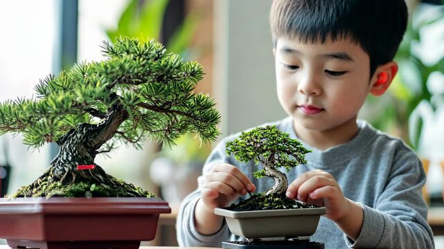 Young boy carefully tending to small bonsai trees indoors in a bright, cozy environment