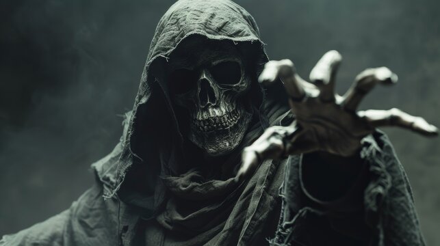 Grim Reaper in a dark hooded cloak, wearing a skull mask, reaching out with bony fingers, set in a shadowy background